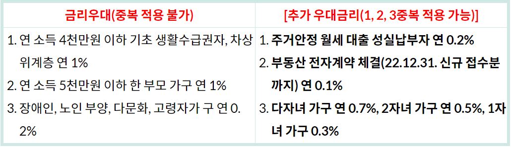 - 대출 신청인과 배우자 합산 총소득이 5천만원 이하(단, 신혼가구, 혁신도시 이전 공공기관 종사자, 타지역이 주재 개발 구역 내 세입자, 다자녀 가구, 2자녀 가구인 경우 6천만원 이하인 자)
