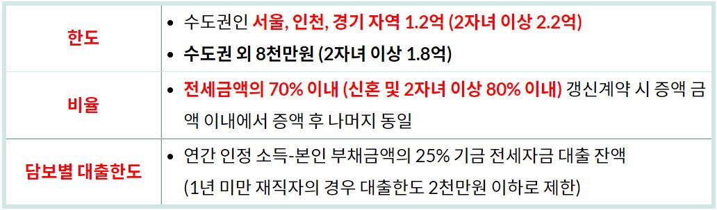 - 대출 신청인과 배우자 합산 총소득이 5천만원 이하(단, 신혼가구, 혁신도시 이전 공공기관 종사자, 타지역이 주재 개발 구역 내 세입자, 다자녀 가구, 2자녀 가구인 경우 6천만원 이하인 자)